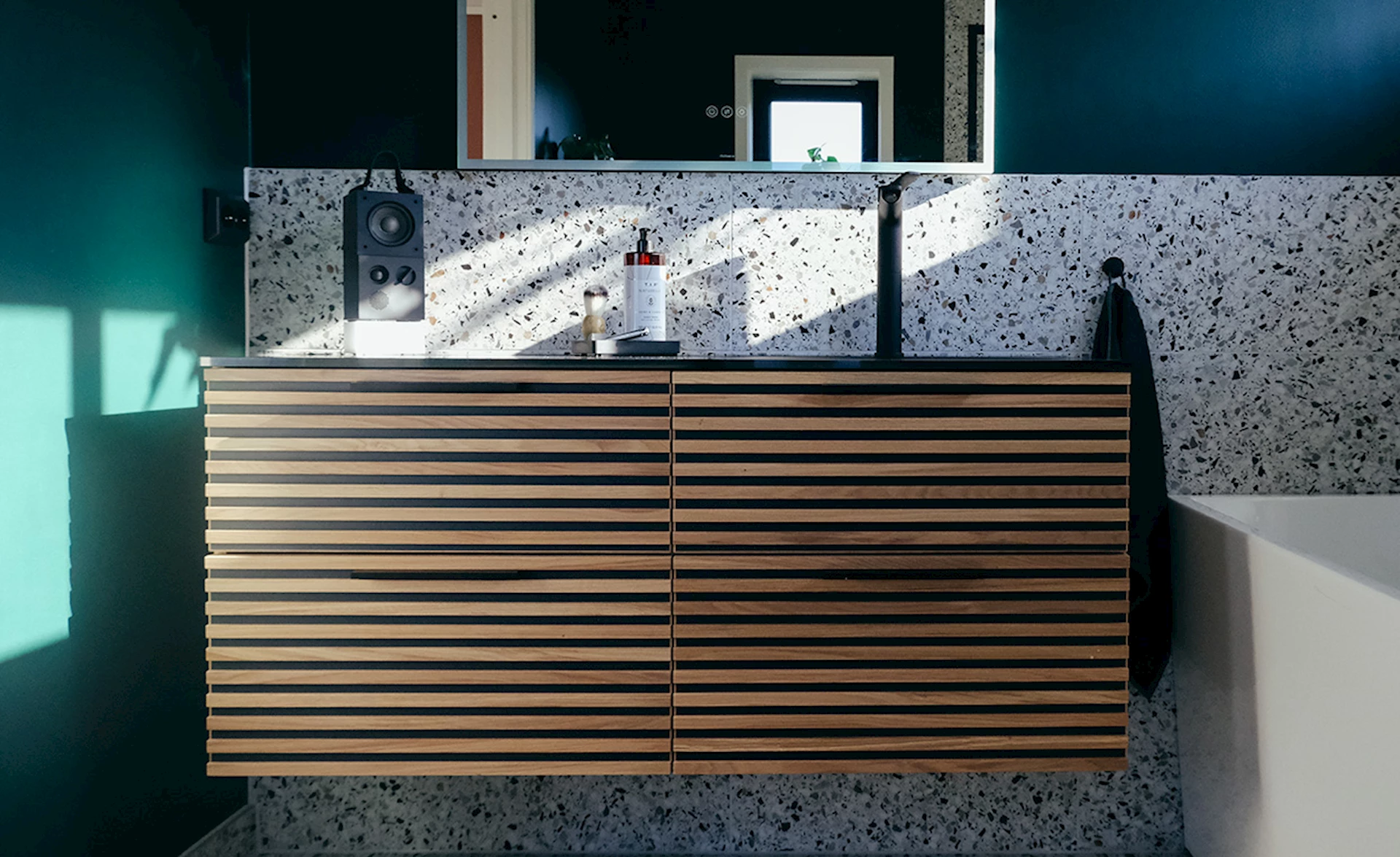 - Vi ønsket oss noe mer dempet og luksuriøst enn et hvitt og sterilt bad, og gikk for sorte detaljer og mørkt tre som sto godt i stil til terrazzo-fliser og grønne vegger.